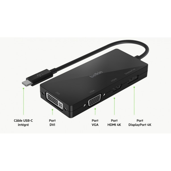 Branchez votre ordinateur portable ou tablette sur un écran HDMI, VGA, DisplayPort ou DVI vidéo avec cet adaptateur USB-C vidéo 4 ports pratique conçu pour être facile d’utilisation. Les résolutions vidéo sont prises en charge par l’adaptateur grâce à son câble USB-C intégré ; un outil idéal pour le bureau, les salles de cours et les présentations orales.