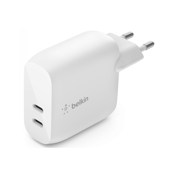 Chargeur Secteur Belkin 2 ports USB-C PD - Deux ports USB-C - Chargeur fonctionnant avec Apple, Samsung, Google et autres smartphones ou tablettes compatibles - Recharge rapide d’un iPhone 12 de zéro à 50 % en 25 minutes et d’un iPad de zéro à 50 % en 40 minutes - Chargeur certifié USB-C PD 3.0 - Puissance :60 W - Couleur blanc