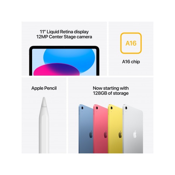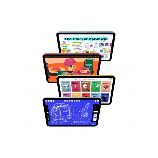 • PERFORMANCES ET STOCKAGE – La puce A16 met ses performances ultra-rapides au service de vos activités préférées. Avec son autonomie d’une journée, l’iPad est idéal pour jouer à des jeux immersifs et faire de la retouche photo et du montage vidéo. Les capacités de stockage disponibles s’étendent de 128 Go à 256 Go.